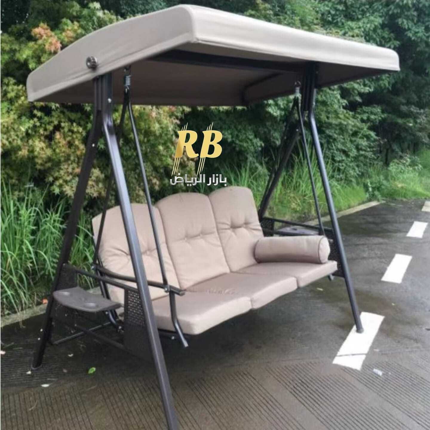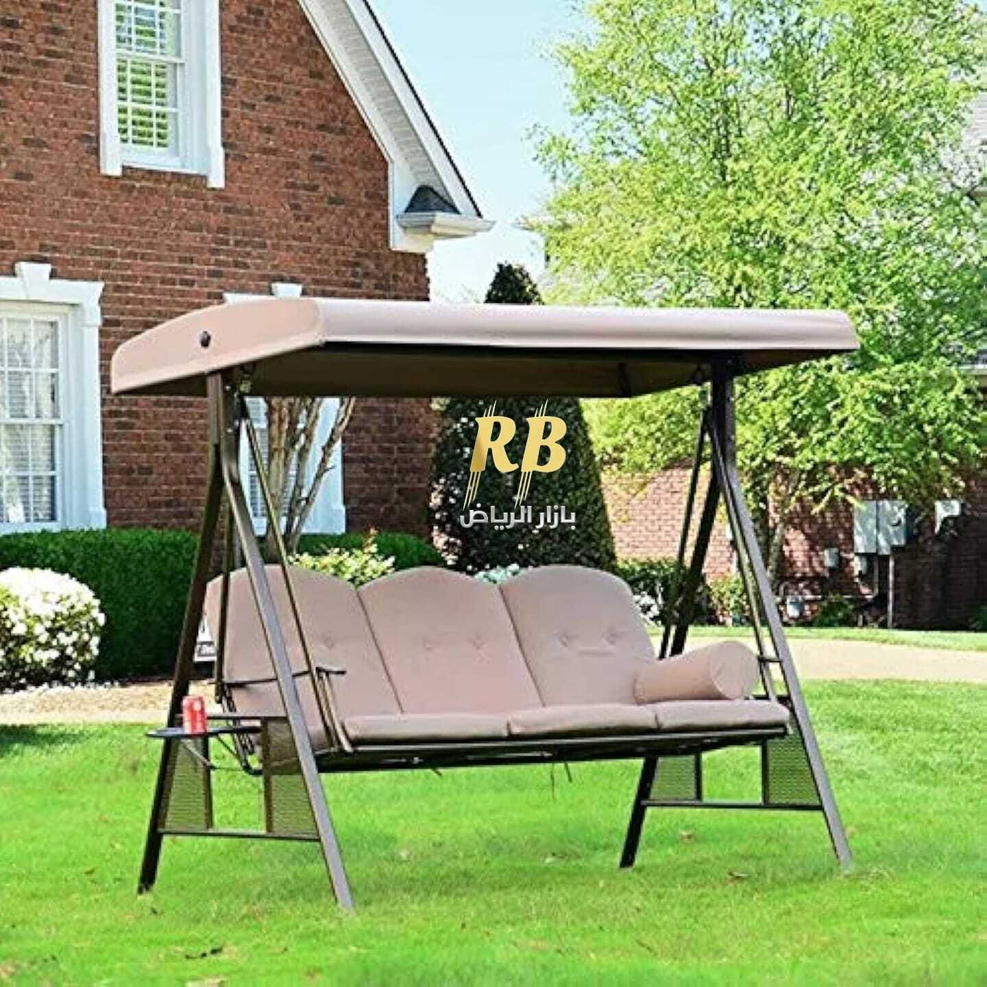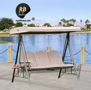 أرجوحة بمظلة ثلاثية المقاعد، توفر الراحة والاسترخاء في الحديقة أو الشرفة، متوفرة بلون البيج الأنيق.