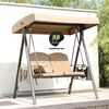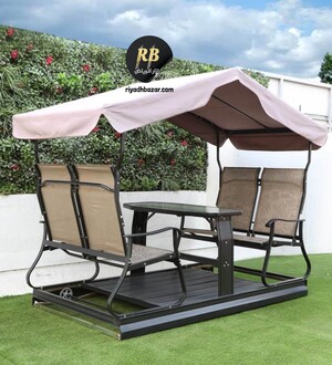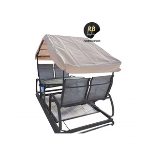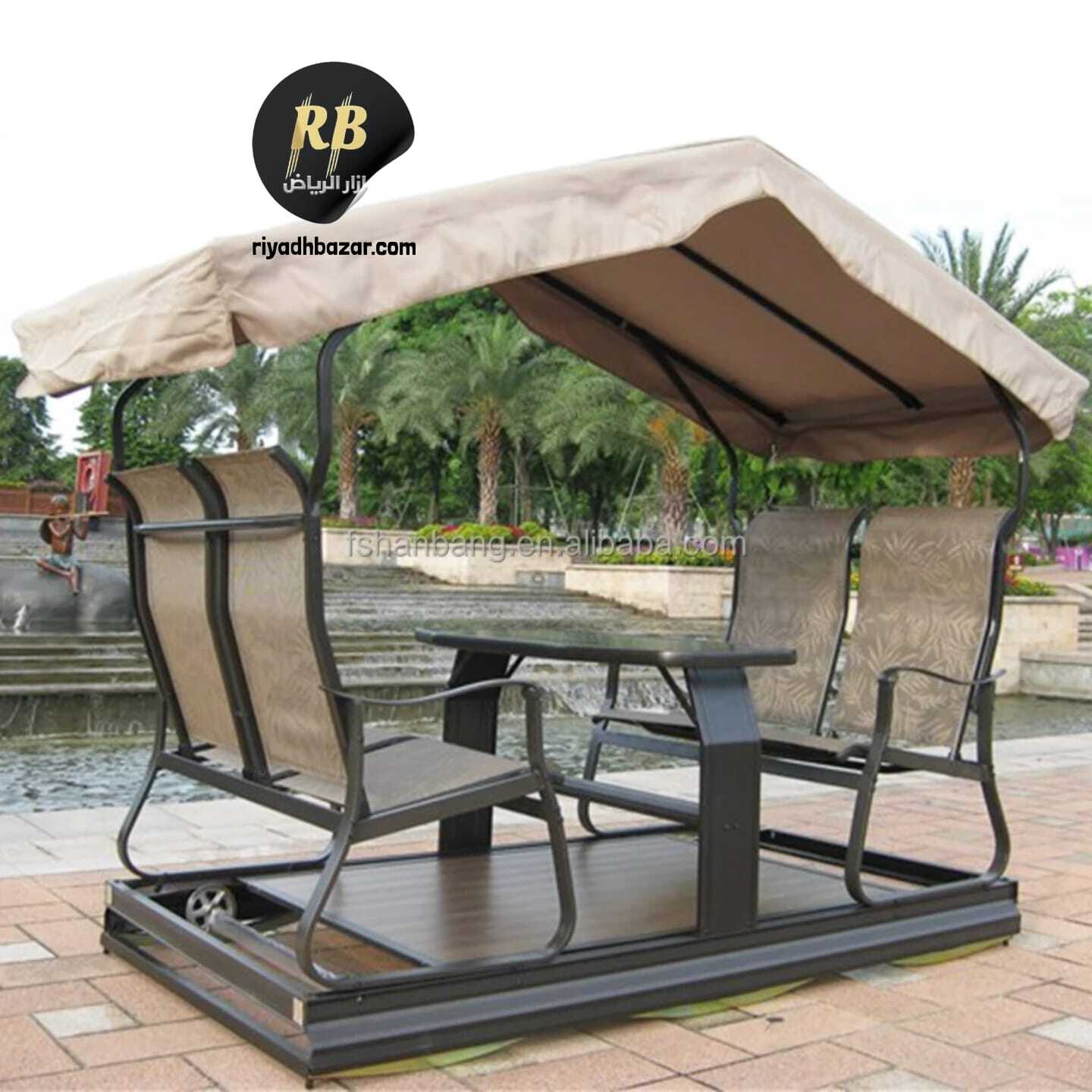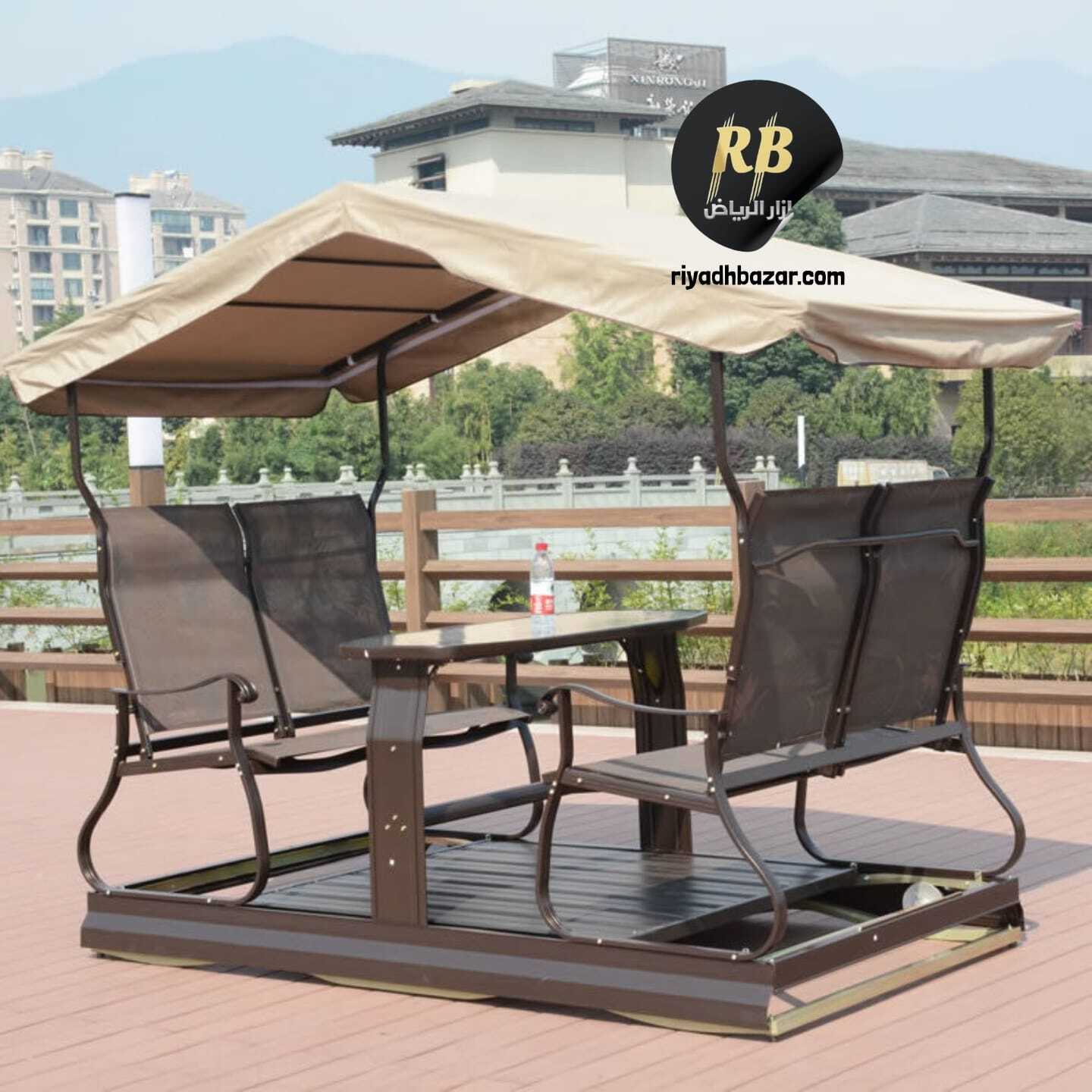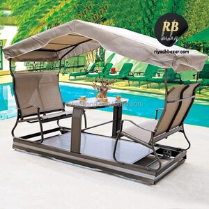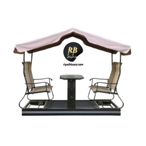 كرسي أرجوحة مزدوج مع طاولة ومظلة مدمجة، مصنوع من إطار معدني متين ومقاعد قماش شبكي مقاوم للعوامل الجوية. تصميم مريح ومظلة توفر حماية من الشمس والمطر، مثالي للاستخدام في الحديقة أو الشرفة.